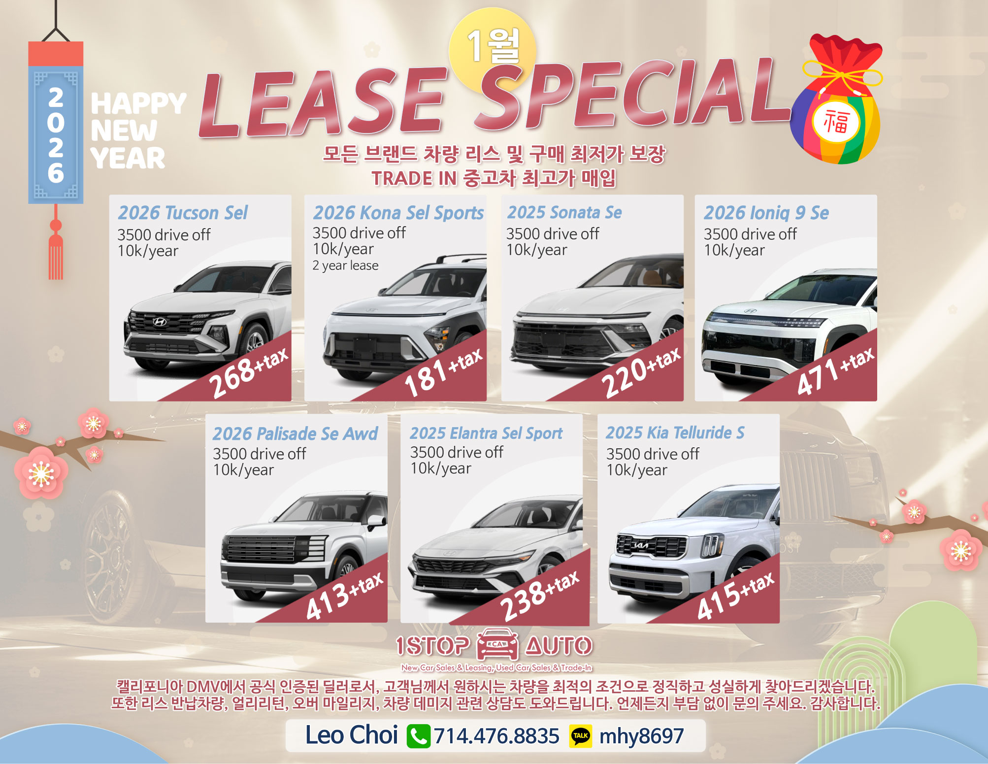 [자동차] 1월 새해맞이 리스 및 구매 최저가 보장 중고차 최고가 매입 보장합니다 714-476-8835